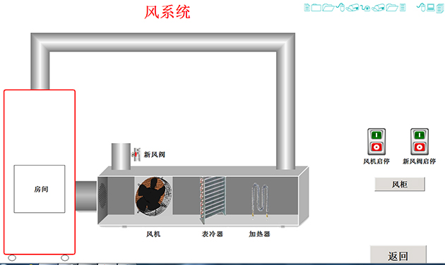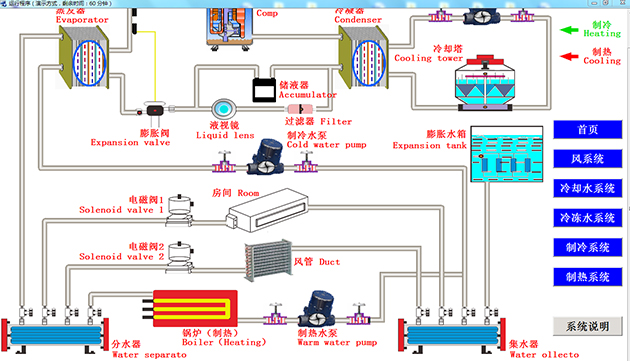 (3),系統(tǒng)故障運行演示:在配置有實物中央空調實訓考核裝置時,在軟件演示故障時系統(tǒng)動畫與實物實時故障同步,讓學生更好地撐握空調原理、操作方法,如壓縮機系統(tǒng)、制冷系統(tǒng)、制熱系統(tǒng)、風系統(tǒng)、集中送風系統(tǒng)、半集中送風系統(tǒng)的原理過程。