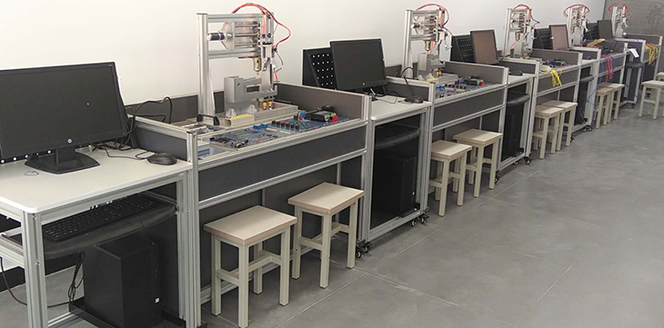 單片機(jī)控制功能實(shí)訓(xùn)考核裝置采用烤漆鋼板制作的臺式結(jié)構(gòu)。實(shí)訓(xùn)臺的抽屜柜用于存放實(shí)訓(xùn)模塊,抽屜柜與臺面之間布置實(shí)訓(xùn)模塊安裝支架,最上一層是工作臺臺面。用于技能競賽時(shí)在臺面上放置設(shè)備安裝底板,在底板上安裝試題擬定的單片機(jī)控制裝置需要的模塊,連接控制電路,編寫的控制程序輸入單片機(jī)后,按下運(yùn)行指令開關(guān),單片機(jī)控制裝置就按程序運(yùn)行。