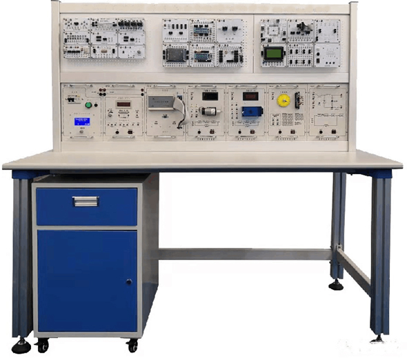 實訓(xùn)臺主要有實訓(xùn)桌和實訓(xùn)臺架組成,實訓(xùn)桌采用型材結(jié)構(gòu),桌腿采用4080型材,桌面為防火、防水、耐磨高密度板,結(jié)構(gòu)堅固,造形美觀大方。面板采用鋁板結(jié)構(gòu),操作面板文字符號用現(xiàn)代彩色噴描技術(shù)處理,具有防塵、美觀、耐磨、不掉色等特點。