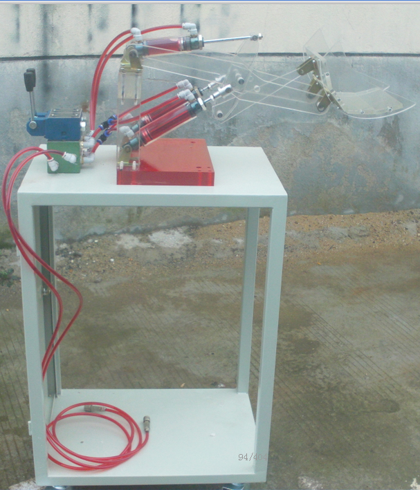 透明裝載機實訓(xùn)臺主要由底柜,透明大臂,透明動臂,透明裝斗,透明油缸,透明集成閥島,透明手動換向閥,支架組成