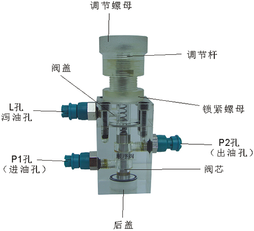2、液控單向閥結構上參考了國產(chǎn)IY-25B型液壓單向閥,其閥體、螺塞等采用了進口透明有機玻璃材料精制而成,閥芯、頂桿采用了45#中碳鋼材料,并配合彈簧,油接頭,密封圈等標準件裝配而成,通過它可明確地觀察到活塞、彈簧、油孔等結構及其運行過程,具有形象逼真,性能可靠等優(yōu)點。它即可作為教學模型,也可以作為液壓實驗元件進行實驗演示。