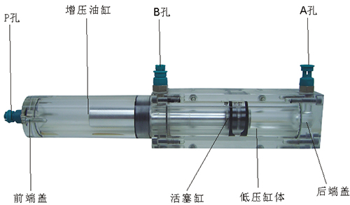 2、增壓油缸的前端、后端蓋、低壓缸體、增壓缸體等均采用了進口透明有機玻璃材料精制而成,透明清晰,活塞桿采用了合金鋁材料,并配合油接頭,密封圈,內(nèi)六角螺絲等標準件裝配而成,通過它可明確地觀察到活塞桿,油封,油孔等結構及其運行過程,具有形象逼真,性能可靠等優(yōu)點,它既可作為教學模型,也可以液壓實驗元件進行實驗演示。
