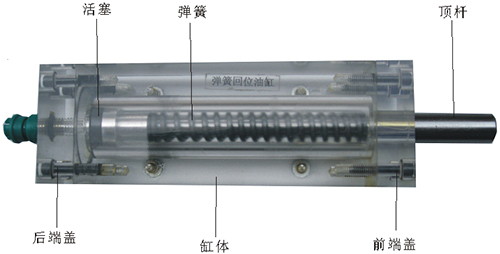 2、彈簧回位油缸的缸體,端蓋等均采用了進口透明有機玻璃材料精制而成,透明清晰,頂桿采用45#中碳鋼材料,并配合油接頭、密封圈、內(nèi)六角螺絲等標準件裝配而成,通過它可明確地觀察到活塞、頂桿、油封、油孔、彈簧等結構及其運行過程,具有形象逼真,性能可靠等腰三角優(yōu)點,它即可作為教學模型,也可作為液壓實驗元件進行實驗演示。