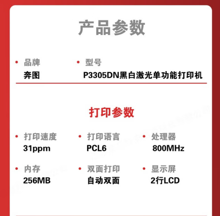 奔圖P3305DN 黑白激光經(jīng)濟型單功能全國產(chǎn)化打印機 速度31頁/分鐘 有線網(wǎng)絡 雙面 支持國產(chǎn)系統(tǒng)