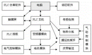 光機(jī)電一體化實(shí)訓(xùn)裝置由型材導(dǎo)軌式實(shí)訓(xùn)臺,典型機(jī)電一體化設(shè)備機(jī)械部件,PLC模塊,變頻器模塊,按鈕模塊,電源模塊,低壓電器模塊,模擬生產(chǎn)設(shè)備實(shí)訓(xùn)模塊(包含上料機(jī)構(gòu),搬運(yùn)機(jī)械手,皮帶輸送線,物件分揀等)接線端子排,各種傳感器,警示燈和氣動(dòng)電磁閥等組成。整體結(jié)構(gòu)采用開放式和拆裝式設(shè)計(jì),學(xué)生可以組裝,接線,編程和調(diào)試由上料機(jī)構(gòu),搬運(yùn)機(jī)械手機(jī)構(gòu),皮帶輸送線和物料分揀組成的光機(jī)電一體化設(shè)備。裝置的總體結(jié)構(gòu)示意圖如圖主所示。