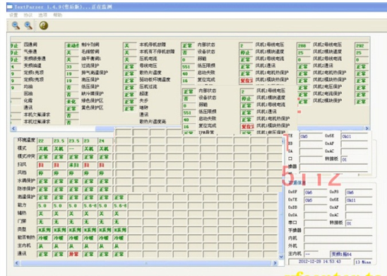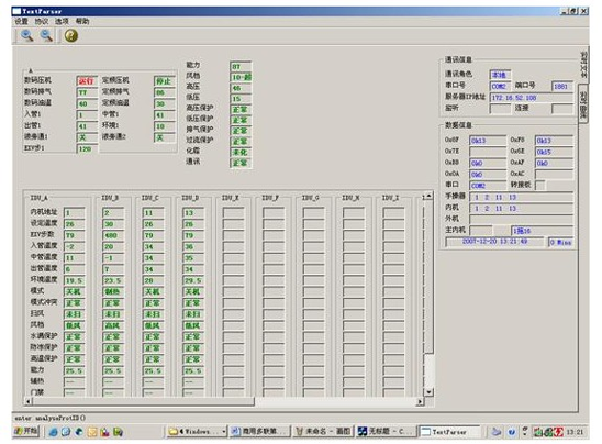 中央空調(diào)機(jī)由于工程復(fù)雜,設(shè)備分散,有的已經(jīng)裝修在開花板上測試程序,一但出現(xiàn)了故障,工程量相當(dāng)大,為了能夠快速準(zhǔn)確地測出故障是由主機(jī)機(jī)組還是室內(nèi)機(jī)的故障的,每個生產(chǎn)廠家根據(jù)生產(chǎn)的和維修的需要而開發(fā)了中央空調(diào)測試程序?蓽y試壓縮機(jī)的運(yùn)轉(zhuǎn)頻率,傳感器的各種數(shù)據(jù),電子膨脹閥的工作步數(shù)等幾十種中央空調(diào)的工作數(shù)據(jù)和狀態(tài),軟件可實現(xiàn)對內(nèi)機(jī)的控制,,可以對1-64臺內(nèi)機(jī)的狀態(tài)進(jìn)行設(shè)定。是高校提供了好的研究的學(xué)習(xí)設(shè)備。