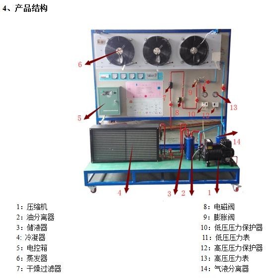 工業(yè)制冷系統(tǒng)實訓(xùn)考核裝置主要由半封閉式制冷壓縮機(jī)、冷凝器、蒸發(fā)器、膨脹閥和故障設(shè)置開關(guān)、測試儀表等組成。實訓(xùn)臺通過手閥開關(guān)和鈕子開關(guān)分別來設(shè)置管路系統(tǒng)和電控系統(tǒng)的 20 多種故障。設(shè)備采用先進(jìn)的電控系統(tǒng)并具有具有開相,缺相, 過流等保護(hù)功能。蒸發(fā)器風(fēng)扇采用變頻器控制速度。配備 8 路溫度計,電壓表,電流表,功率表,功率因數(shù)表和壓力表,能實時觀察運行參數(shù)