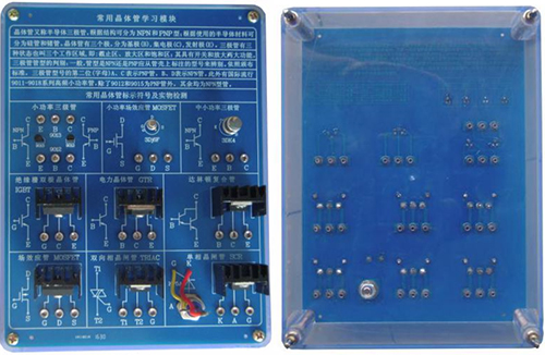底盒使用190mm×145mm的開模有機透明塑料底盒,模塊面板采用印制電路板PCB工藝,可以直觀看到器件的實物及相關(guān)的原理介紹。對于典型應用及易損器件安裝在面板背面,透過透明底盒能夠看到器件實物,方便感性認識、檢測測試,同時也能防止器件的損傷。