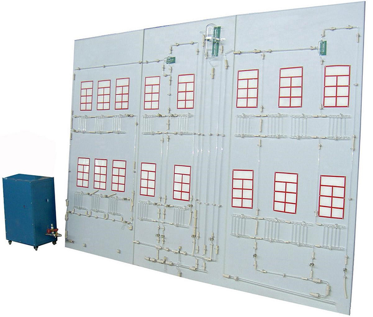 模擬采暖散熱器片、采暖供水干支管道、回水干支管道、集氣罐、高位膨脹水箱、溢水管、信號(hào)管、循環(huán)管、排水管、膨脹管、模擬房間墻面、模擬供暖鍋爐、供水泵、供水箱、實(shí)驗(yàn)臺(tái)框架等。